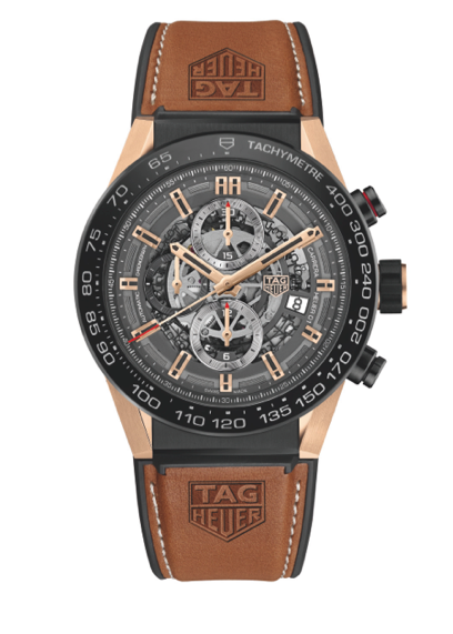 Este cronógrafo de manufactura recupera todas las características del Heuer-01 original: la carátula esqueleto, que a partir de ahora forma parte de la firma del modelo, la caja de 45 mm de diámetro (esta vez de titanio), así como el bisel con escala taquimétrica. Para añadir un toque de lujo, las asas del reloj, así como las agujas y los índices, son de oro rosa de 18 K.